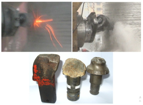 There have been increasing difficulties related to rocks like sandstone and aracenaous shale, as these have an almost homogeneous structure, causing serious problems with their mining, especially when milling-based mechanical methods are employed. An equally important factor is the presence of hard minerals and inclusions in rocks, causing mining tools to sustain rapid abrasive damage and wear. Additionally, in the case of inclusions such as sphaerosiderites, mining works produce heavy sparking [5,8,9,10]. As already mentioned, milling also generates dust. These three problems encountered in the milling-based removal process are shown in Figure 4.