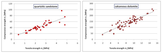 The relationship between the compressive strength and the tensile strength for selected Permian rocks—quartzitic sandstone (on the left) and calcareous dolomite (on the right).