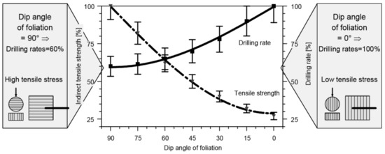 Figure 7 shows the results of phase-one tests. The boreholes were drilled perpendicular and parallel to bedding surfaces and at angles of intermediate values. The tensile strength σt for samples whose bedding surfaces were at the same angles of inclination was also determined. It can be noticed that the value of the tensile strength σt for samples with layers parallel to the ultimate-force direction is as much as three times lower than for samples with perpendicular layers. This results in an almost 60% increase in the drilling rate [17].