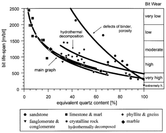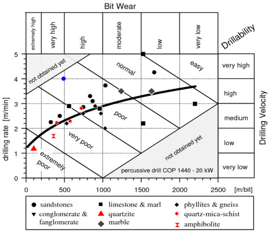 Rock and rock mass properties affected the rock body penetration ability, what in turn, immediately affects bit wear and drilling rate [2,16,17,18]. Based on the investigation results gathered by Thuro [17], the chart as shown in Figure 9 was designed, to calculate the drilling efficiency and the drilling-tool wear for various types of excavated rocks. It is easy see that high abrasive rocks (quartzite, amphibolite) make the biggest problem in effective drilling.