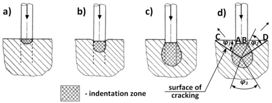 As the force increases, so does the indentation zone’s range of depth (Figure 10b), although the reduction in rock volume is initially set off by elastic deformations of the surface. With the load increasing further, the rock shear strength along the pin’s circumference (dotted line) is overcome (Figure 10c), and the pin penetrates slightly into the rock. The indentation zone reaches deeper, while the cracks along the pin’s circumference do not reach deep. As the load exerted by the pin increases further, the tensile stress occurring around the indentation zone causes initial internal cracks in the weakest spot (Figure 10d).