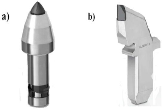 Types of cutting tools used in cutting or milling: (a) rotary-tangential pick, (b) radial pick [4].