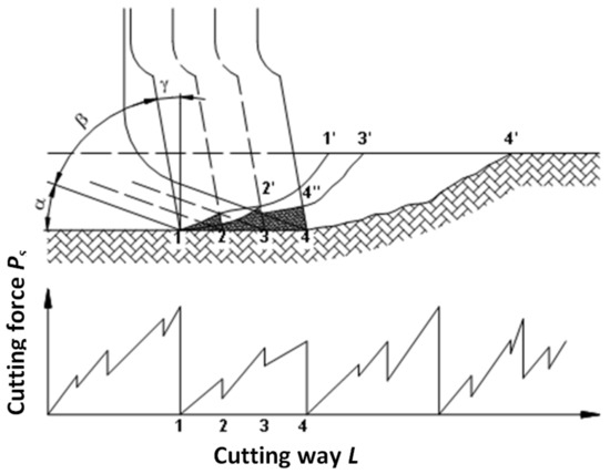 Mining by cutting involves a wedge-like or conically shaped tool acting almost parallel to the rock surface. The tool has a holder for mounting on the cutting head and the working part, which does the cutting, featuring a cemented-carbide insert. The tool has the following angles [19]: α—clearance angle, β—pick angle, and γ—angle of attack, the sum of which is α + β + γ = 90°. The head-mounted tool moves along with the cutting head relative to the machine body. The cutting produces a fissure with the depth g. In order for the machine to cut the rock instead of crushing it, the clearance angle must be α > 0.