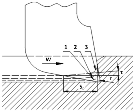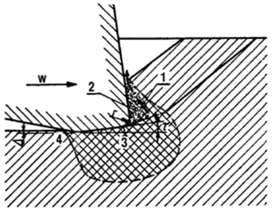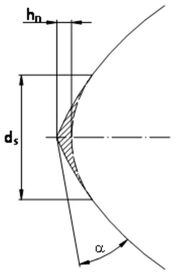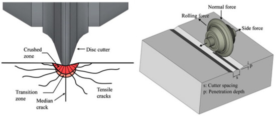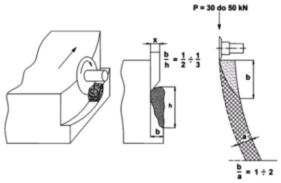 The indentation layer theory [21] provides a convincing explanation of the mining process. The range and shape of the indentation zone varies between individual processes depending on the pick geometry and direction of the main component of the force exerted by the tool on the rock, causing its failure. This direction may be either tangential or perpendicular to the rock. The former case involves cutting, while the latter involves crushing.