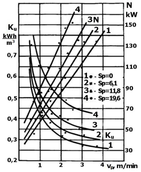 Thus, the specific energy expressed as Equation (1) is the energy required to excavate a unit of a rock’s volume. The lower the specific energy, the more efficient the process. However, using specific energy as a measure of process efficiency should be approached with caution.