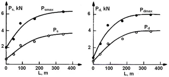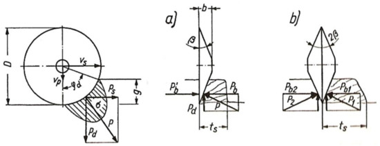 Depending on the physicochemical properties of the excavated rock and the pick shape, in order to cut the rock to the depth g, the force P must be applied to the pick to counter the force coming from rock mining resistance. The force P exerted on the pick can be distributed into three constituent forces exerted in three perpendicular directions: the force exerted along the fissure, called the cutting force Ps—which plays the key role in the cutting process, the force exerted perpendicular to the fissure bottom—the pressure force Pd that counters the friction force produced by the cutting force Ps, and the force that is perpendicular to them—the lateral force Pb.