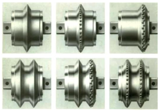 There are three types of symmetrical disc tools: smooth discs, discs fitted with inserts, and toothed discs in single-, double-, or tripe-bladed versions. The first two, shown in Figure 24, are the most common. They can be as large as 500 mm in diameter [3,36,37]. Smooth single-bladed disc tools can advance up to several kilometers of roadways or tunnels without visible wear. By comparison, the service life of a cutting tool is no more than several cubic meters of output.