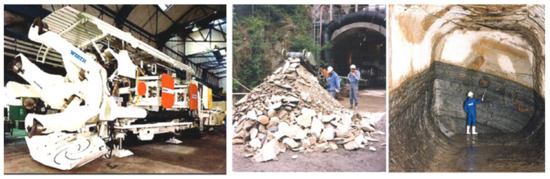 View of heading face driven using blasting material—left (drilling car and loader made by Deilmann Haniel), and mechanically—right (MT720 roadheader made by Sandvik) [4,7].