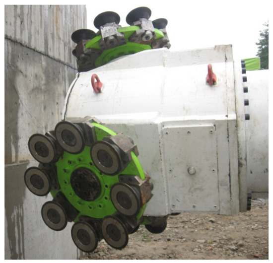 The disadvantage of mining by static crushing is the need to ensure a high pressure force exerted by the tool. Stone rock disintegration is the result of the rock’s uniaxial compression strength being exceeded. According to available data, the value of the pressure force per disc tool, as shown in Figure 25, can be as high as 300 kN. A large number of disc tools on the mining head produce tremendous combined pressure force (up to 25,000 kN) and lateral spreading force that is multiple times greater to ensure operational stability of the TBM. The mining machine must transfer the reactions coming from the mining head and stabilizing struts. These large reaction forces are the result of the considerable weight (up to 3500 Mg) and size of the machine (a TBM can be as long as 400 m). Figure 25 shows an image of the mining head of Robbins TBM. This results in the limited use of this type of machinery for driving with a very high advance. Only in this case very large costs connected to their production and assembly in the mining excavation can be paid back [3,36,37].