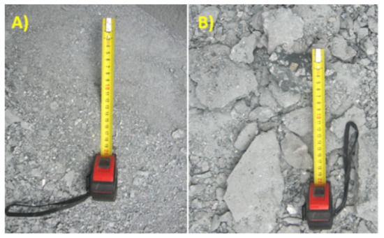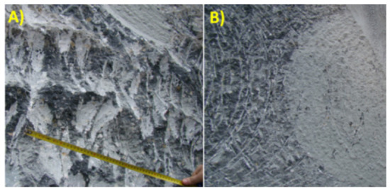 A view of the resulting concrete block surface after mining with (A) a mining head with complex-trajectory disc tools, and (B) a standard mining head [39].