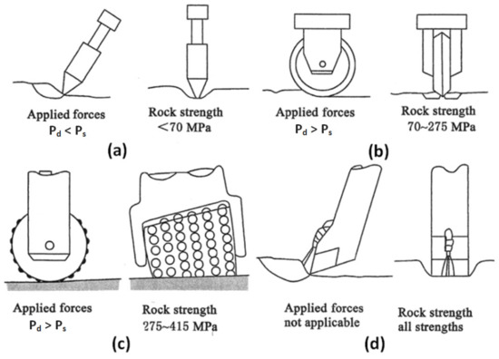 Proposed applications of mining tools for various rock media: (a) tangential-rotary picks, (b) symmetrical disc tools (c) roller discs, and (d) cutting tools supported by water jets [15].