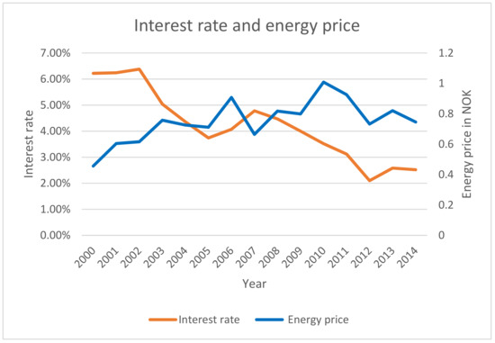 Energy price and interest rate year 2000–2014. The interest rate is given by the Norwegian 10-year government bond and the energy price is from the energy price area of Oslo [20,21,22].
