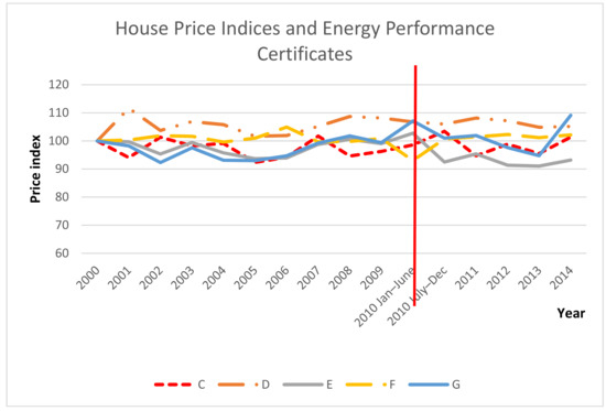 The nature of the potential causal relationship between energy labels and sales prices is crucial for our analysis. As a robustness check to test this relationship, we utilize the natural experiment that took place when the energy labels became mandatory in July 2010. The data allow us to compare the transaction prices of dwellings sold before and after the introduction of the EPC system in July 2010. If energy labels affect the sale prices, then two houses sold in, for example, 2008, for approximately the same price, should have approximately the same price as each other when resold after July 2010 if they were given the same energy label. On the other hand, if one of them received a higher energy label than the other, it should, ceteris paribus, have a higher resale price.