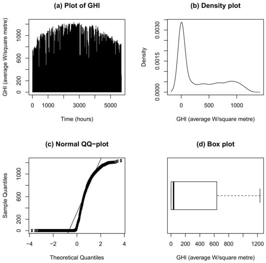 In this paper, the focus is on probabilistic solar irradiance modelling and forecasting. Probabilistic forecasts take probability distributions of future events into account. They are preferred over deterministic forecasting because they take into account the uncertainties in the predicted values which help in taking effective decisions. Therefore, it is believed that probabilistic forecasting can become a power trend in solar irradiance forecasting []. Providing the full predictive density or providing prediction intervals of the forecasts help decision makers in power utility companies in assessing future uncertainty of the power supply [,].