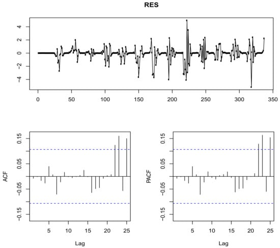 where s is the seasonal length, L is a lag operator, is the non-seasonal autoregressive (AR) operator, is the seasonal AR operator, is the non-seasonal moving average (MA) operator, is the seasonal MA operator. The operators and are the non-seasonal and seasonal difference operators of order d and D, respectively, with denoting a white noise process. This modelling approach is used to reduce the autocorrelation in the residuals. Similar studies are discussed in literature, see for example, References [] and [], among others. Now let