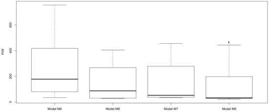 Providing prediction intervals of the future forecasts helps decision makers in power utility companies in assessing future uncertainty of the power supply [,]. We discuss briefly in the following sections, prediction interval widths and performance of estimated prediction intervals.