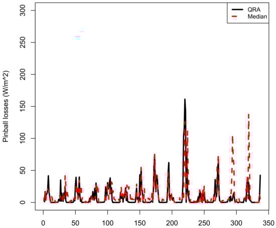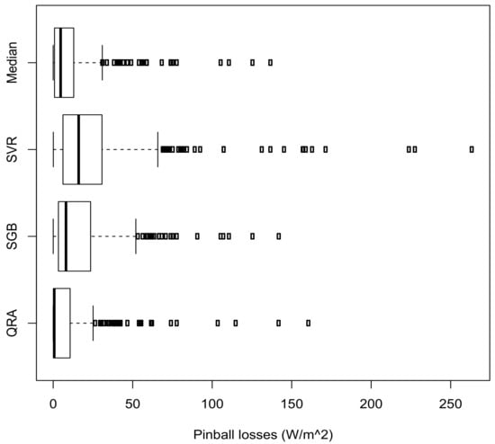 Top panel: Plot of pinball losses from the quantile regression averaging (QRA) and Median models in April 2010 (8–22 April 2010, 337 forecasts). Bottom panel: Box plots of pinball losses from the QRA, SGB, SVR and Median models in April 2010.