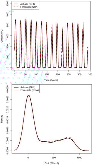 The forecasts from the combined median approach follow the actual solar irradiance remarkably well (Figure A1 top panel). Bottom panel of Figure A1 presents the density plot of the forecasts.