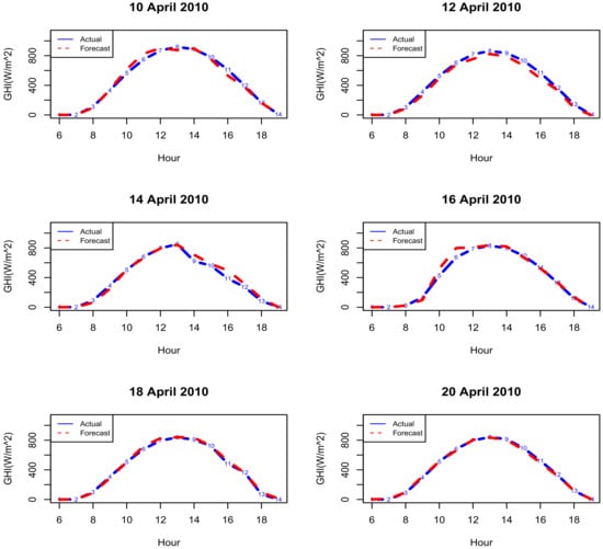 Figure 8 shows actual GHI, solid lines superimposed with forecasts, dashed lines (QRA forecasts) for some selected days of April 2010. For all the selected days, the forecasts follow the actual GHI remarkably well.