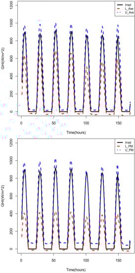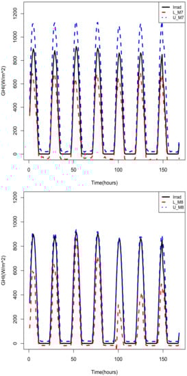 Time series plots of GHI with lower and upper 95% prediction intervals for 7 days (8-04-2010 to 18-04-2010) are presented in Figure 9 (M7 and M8 models) and Figure 10 (Averaged and PM prediction intervals), respectively.