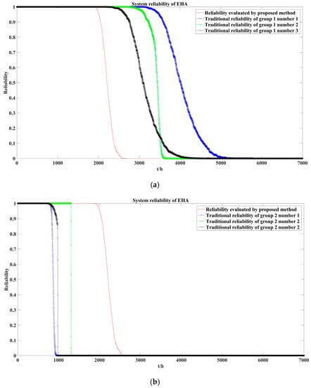 With different individual failure thresholds, the reliability evaluated by the individual failure thresholds are shown in Figure 10. We can see that in Figure 10a, when the summation of equivalent FED of each individual threshold is larger than the system FED threshold, the reliability evaluated by the traditional method has a greater margin than the proposed method, which is in accordance with the fact that larger thresholds mean more tolerance of degradation. In Figure 10c, when the summation of the equivalent FED of each individual threshold is less than the system FED threshold, then the reliability evaluated by the traditional method has a smaller margin than the proposed method. For group 2, the traditional method has less tolerance of degradation than the proposed method, which can be explained by the fact that, although the pump has already met the presupposed threshold, for the system, it can still be used. On this basis, the proposed method is less rigorous than the traditional method, when the summation of equivalent FED equals the system FED threshold.