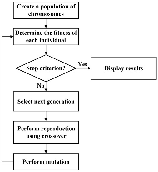 In [29,30,31,32], the MPPT algorithms with intelligent prediction were introduced. Some of the algorithms used fuzzy logic to vary the step size [29,30,31]; the fuzzy logic method consists of fuzzification, a fuzzy rule-based lookup table (Table 3), and defuzzification. First, the input variables (ΔIPV and ΔPPV) are converted into fuzzy subsets such as negative big (NB), negative small (NS), zero (ZO), positive small (PS), and positive big (PB) depending on ΔIPV and ΔPPV. Then, one fuzzy subset is determined based on the rule-based lookup table and it provides a numeric step size. The MPPT algorithm using fuzzy logic is effective in dealing with the nonlinear characteristics of the PV module because the fuzzy logic divides the nonlinear system in the fuzzy subsets defined by the variables (ΔIPV and ΔPPV) and controls the nonlinearity of system using the rule base for each area (See Table 3). Therefore, it can track the MPP well under dynamic weather conditions. However, compared to other MPPT algorithms such as adaptive P&O and INC algorithms, it requires a digital signal processor (DSP) with higher specification and also makes the user’s design more difficult because of its higher complexity of algorithm and execution process [27,31]. This is a disadvantage for commercialization. The other MPPT algorithm of [32] changed the step size by using a PID controller tuned by genetic algorithm. First, the genetic algorithm evaluates a number of solutions known as chromosomes using a fitness function, and later, genetic operators (selection, crossover, and mutation) are applied until a stop criterion is satisfied (Figure 4). Based on this principle of the genetic algorithm, the PID coefficients (Kp, Ki, and Kd) are determined to vary the step size. This MPPT algorithm also has good performance under dynamic weather conditions, but it requires high computational capability and sophisticated controllers due to its complexity.