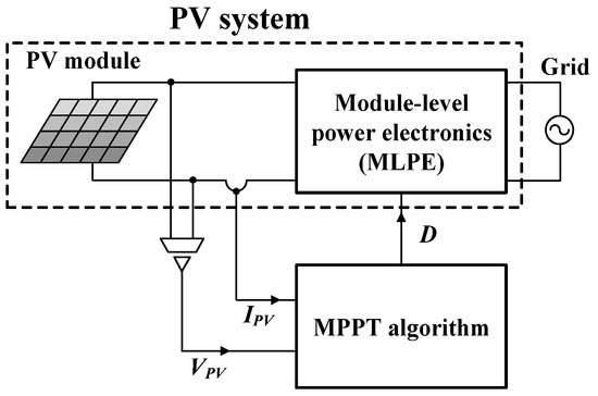 A distributed PV system with the MPPT algorithm is shown in Figure 5; the system consists of one PV module and one MLPE. Due to the fact that the PV module converts sunlight into low DC voltage, the MLPE requires a high voltage gain to convert low DC voltage into high AC voltage with grid frequency. The MPPT algorithm controls the duty ratio (D) of the MLPE to operate at the MPP of the PV module. To perform the MPPT algorithm, the voltage (VPV) and current (IPV) of the PV module are used as input signals.