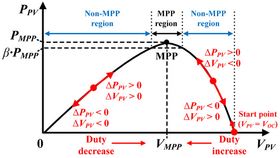 As shown in Figure 9, the proposed MPPT algorithm has two operating regions including the MPP (PPV > β∙PMPP) and non-MPP (PPV < β∙PMPP) regions, where β is an MPP region coefficient. The operating point starts at VPV = VOC and move with fast tracking speed toward the MPP (VMPP, PMPP). The direction of the operating point is determined using ΔPPV and ΔVPV, where Δ means the difference between the present and previous values. In addition, the present PPV is compared with PMPP to search the MPP.