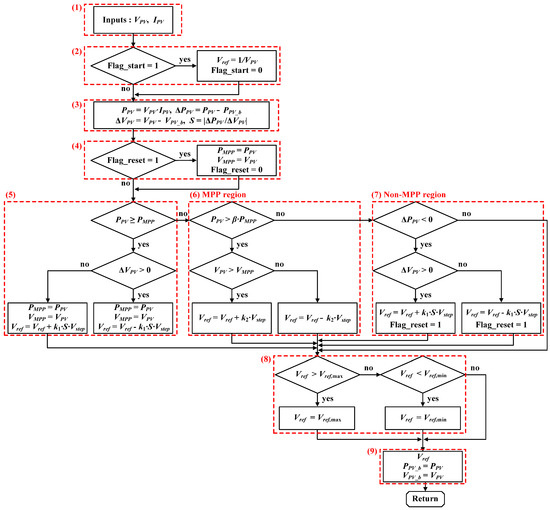 The flow chart of the proposed MPPT algorithm is shown in Figure 10, and it is described as follows: