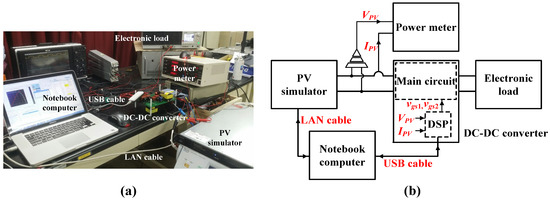 Figure 12 shows the equipment settings to evaluate the performances of the MPPT algorithms. The output cable of the PV simulator (ETS60 from AMETEK Inc.) is connected to the input of the DC–DC converter (boost half-bridge topology), and the LAN cable of the PV simulator is connected to the notebook computer to set the characteristic curve (Figure 13) of the commercial 300-W PV module (Q.PEAK-G4.1 300 from Hanwha Inc.). Here, according to the irradiance level (E) and the module temperature (T), the electrical characteristics of the PV module “Q.PEAK-G4.1 300” are listed in Table 4. The output of the DC–DC converter is connected to the electronic load (DL1000H from NF Corp.) to consume the energy, and the notebook computer is connected to the DSP (TMS320F28335 from Texas Instruments Inc.) in the DC–DC converter by USB cable. The power meter (PW3336, from HIOKI Inc.) is used to measure the voltage (VPV), current (IPV), and power (PPV) of the PV simulator. Based on the sensed VPV and IPV, the DSP runs the MPPT algorithm and generates the gate signals (vgs1, vgs2) for operating the DC–DC converter. To compare the dynamic and energy utilization performances of the MPPT algorithms, four experiments were performed as follows.