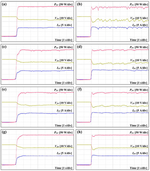 First, the proposed MPPT algorithm and the conventional MPPT algorithms including a basic P&O of [21], an adaptive P&O of [26], and an adaptive INC of [27] were tested at the STC of E = 1000 W/m2 and T = 25 °C. Figure 14 shows the measured VPV, IPV, and PPV waveforms of the PV module when each MPPT algorithm is applied to a DC–DC converter. The basic P&O algorithm with a small fixed step size tracked the maximum power point (MPP) slowly, but it had small oscillations after reaching the MPP (Figure 14a). When the fixed step size increased, the tracking speed of the basic P&O algorithm increased as well, but the oscillations also increased (Figure 14b). To solve the problem of the fixed step size, the adaptive P&O and adaptive INC algorithms used a variable step size proportional to k1·ΔPPV/ΔVPV. However, these algorithms still had the oscillations at the MPP because the ΔPPV/ΔVPV is easily affected by sensing and calculation errors, sensing noise, and the ripples of VPV and IPV (Figure 14c–f). If the coefficient k1 is smaller, the oscillations at the MPP decreases, but the tracking speed is slower. To improve the problems of the previous MPPT algorithms mentioned above, the proposed MPPT algorithm uses two methods that can apply the optimal step size to each operating range. In the operating range near the MPP, a small fixed step size is used to minimize the oscillations at the MPP, but in the operating range far from the MPP, a variable step size proportional to k1·ΔPPV/ΔVPV is used to achieve fast tracking speed. The proposed MPPT algorithm can adjust the tracking speed using k1 so that it can track the MPP quickly. As a result, the proposed MPPT algorithm tracked the MPP with faster tracking speed and had smaller oscillations at the MPP when compared with the conventional algorithms (Figure 14g,h).
