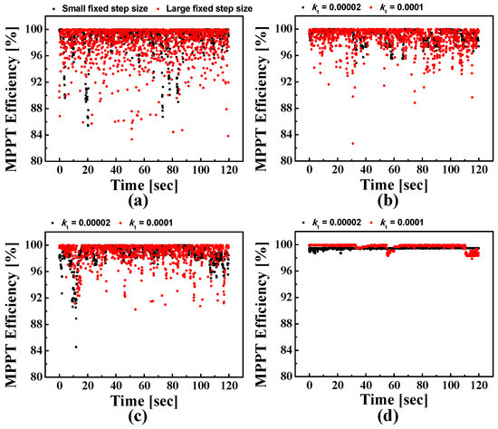 The MPPT efficiencies of the proposed and conventional MPPT algorithms were measured for two minutes after reaching the MPP under the same conditions as in Figure 14 (Figure 15). When a large fixed step size was applied, the basic P&O algorithm had the lowest average MPPT efficiency of 97.8% due to the largest oscillations at the MPP (Figure 15a). The adaptive P&O and adaptive INC algorithms with high k1(=0.0001) had higher average MPPT efficiencies of 98.5% and 98.7% than that of the basic P&O algorithm because they used variable step sizes (Figure 15b,c). In addition, the adaptive P&O and adaptive INC algorithms had higher average MPPT efficiencies of 99.1% and 98.9% than 98.7% of the basic P&O algorithm when small fixed step size and low k1(=0.00002) were applied. The proposed MPPT algorithm had the highest average MPPT efficiencies of 99.4% and 99.7% at low k1(=0.00002) and high k1(=0.0001) because it had the smallest oscillations at the MPP (Figure 15d).