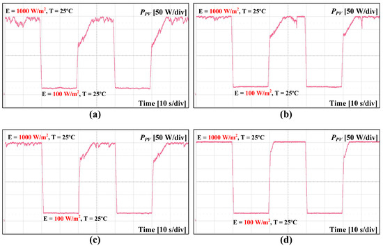 The PPV waveforms were measured to compare the performances of the proposed and conventional MPPT algorithms when irradiance level changed abruptly from 1000 W/m2 to 100 W/m2 or from 100 W/m2 to 1000 W/m2 at a constant temperature of 25 °C (Figure 16). In each MPPT algorithm, the fixed step size and k1 were optimized by considering the trade-off between the tracking speed and the oscillations under the given conditions. When irradiance level changed from 100 W/m2 to 1000 W/m2, the basic P&O algorithm tracked the MPP within 20 s but had large oscillations (Figure 16a). The adaptive P&O and adaptive INC algorithms also tracked the MPP within 20 s, but they still had oscillations (Figure 16b,c). As shown in Figure 14c–f, these algorithms could reduce the oscillations using a small fixed step size or k1, but the tracking was slower. The proposed MPPT algorithm had no trade-off between the tracking speed and the oscillations because it uses a variable step size proportional to k1·ΔPPV/ΔVPV in the operating range far from the MPP and a small fixed step size in the operating range near the MPP. Therefore, when the irradiance level changed from 100 W/m2 to 1000 W/m2, the proposed MPPT algorithm showed smaller oscillations and faster tracking speed than other algorithms (Figure 16d).