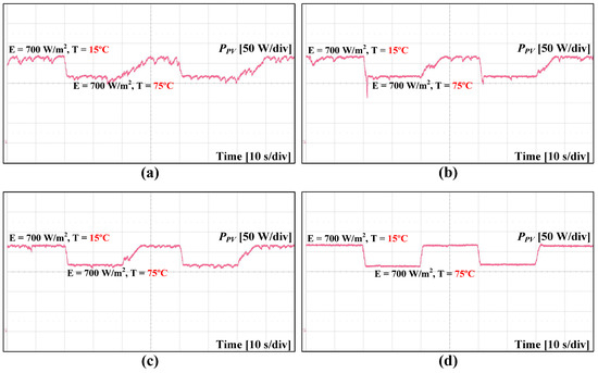 Figure 17 shows the PPV waveforms measured to compare the performances of the proposed and conventional MPPT algorithms when the temperature changed abruptly from 15 °C to 75 °C or from 75 °C to 15 °C at a constant irradiance of 700 W/m2. In each MPPT algorithm, the fixed step size and k1 were optimized by considering the trade-off between the tracking speed and the oscillations under the given conditions. The basic P&O algorithm slowly tracked the MPP due to the fixed step size when the temperature changed from 75 °C to 15 °C (Figure 17a). The adaptive P&O and adaptive INC algorithms tracked the MPP faster than the basic P&O, but they still had oscillations after reaching the MPP (Figure 17b,c). The proposed MPPT algorithm not only had the fastest tracking speed but also had the smallest oscillations after reaching the MPP because it had no trade-off between the tracking speed and the oscillations (Figure 17d). The above results of the comparison experiments are summarized in Table 5.