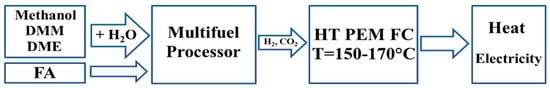 Growing interest in, and demand for, high temperature proton exchange membrane fuel cells (HT PEM FC) has evidently manifested itself during the past decade due to their high tolerance to fuel impurities compared to the low temperature (LT) PEM FC [1,2,3]. For instance, the HT PEM FC can be fueled by hydrogen-rich gas containing up to 3 vol.% of CO [1]. Analysis of current literature shows that gas mixture with this composition can be produced by catalytic conversion of oxygenates such as methanol [4,5,6], dimethyl ether (DME) [7,8,9], dimethoxymethane (DMM) [10,11,12,13,14] and formic acid (FA) [15,16,17,18,19,20,21,22,23]. The obtained H2-rich gas can be directly used as fuel without complex CO removal processes. This makes the HT PEM FC-based power units more compact and simple. The typical HT PEM FC-based power unit scheme is shown in Figure 1.