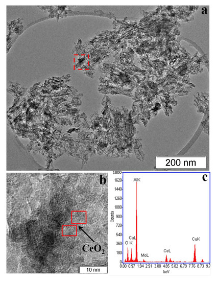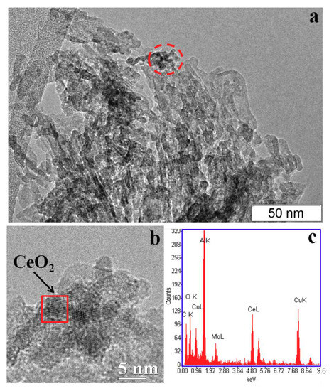 TEM image (a) of the fresh CuO-CeO2/γ-Al2O3 catalyst and the HR TEM (b) and EDX spectra (c) of the marked area.