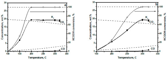 Figure 4 demonstrates dependencies of FA conversion and outlet H2, CO2, CO concentrations at FA decomposition over 10%Cu-5%CeO2/γ-Al2O3 catalyst at GHSV of 3500 h−1 (Figure 4a) and 35,000 h−1 (Figure 4b) on temperature. Equilibrium values are shown by dashed lines. The equilibrium compositions were calculated assuming equilibrium mixtures contained only H2, H2O, CO2 and CO. The equilibrium and experimental values of H2O are not shown because they coincide with respective values of CO, as well as the equilibrium values of CO2 which are nearly similar to those of H2.
