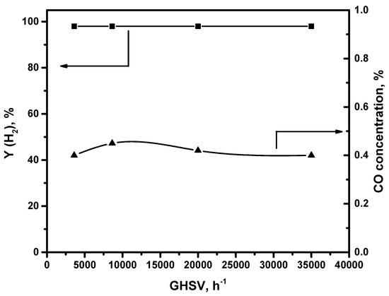 Figure 5 illustrates how the hydrogen yield and CO concentration depended on the reaction mixture feed rate at FA decomposition over CuO-CeO2/γ-Al2O3 at 300 °C. It shows that, even with ten-fold increase in GHSV, the hydrogen yield and CO concentration remained almost unchanged and amount to 98% and 0.4 vol.%, respectively.