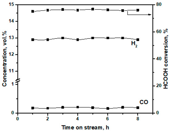 So, the results obtained (Figure 4, Figure 5 and Figure 6) show that complete conversion of FA over 10% CuO-5% CeO2/γ-Al2O3 was reached at temperatures 200–300 °C, yielding H2 and CO2 as the main products. The CO concentration was below 0.5 vol.%. The catalyst provided high hydrogen yield (~100%) in a wide range of GHSV = 3500–35,000 h−1 at temperatures 200–300 °C.
