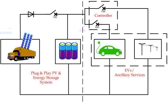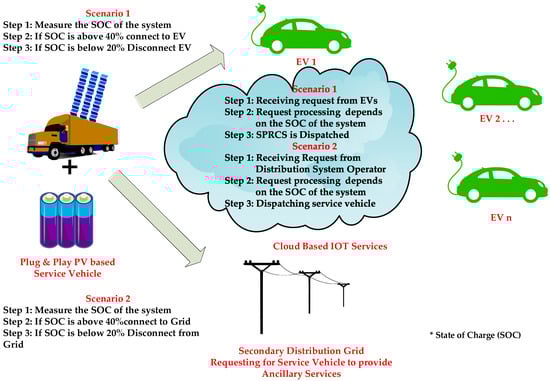 The potential combination of solar energy with rapid charging systems makes the low voltage distribution network free from overloading of distribution transformers, overloading of network feeders and avoids various impacts caused by the charging of EVs. The main requirement for developing the mobile plug and play system is to avoid charging session congestion and to provide flexible charging scenario. Apart from the mentioned need, it is quite difficult to provide onsite solar generation for all the stations. The onsite solar power generation over the System vehicle makes the proposed system act as a distributed energy resources (DER). The system can deploy wherever there is a requirement, i.e., independent of location and it can provide charging and emergency charging session irrespective of the time when there is a request from EVs [5,6,7]. The need for the mobile EV charging stations is going to be a potential leap towards the charging station development. Due to the mentioned advantages of SPRCS, the proposed model can act as the best solution for a rapid charging station in the near future. The plug and play type SPRCS is presented in Figure 1. The SPRCS can function in two schemes as scheme 1 and scheme 2. Scheme 1 represents scenario 1, where the charging request from the incoming EVs is processed. Scheme 2 represents scenario 2, which connects SPRCS to the low voltage distribution grid. The design of rapid charging was considered in this paper.