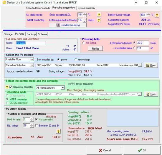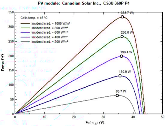 Sizing of the SPV required to charge the system batteries is shown in Figure 6. It consisted of pre-sizing suggestions and user needs. The system requirement was to charge the system batteries during a time when abundant solar energy was available. For this work, the sizing of the SPV system was 20 kWp. The voltage vs. current (VI) and power vs. voltage (PV) characteristics curve for the PV module CS3U-360P P4 are shown in respective Figure 7 and Figure 8. On average irradiation between 500 W/m2 to 800 W/m2, the chosen solar panel was able to produce 198 to 266 W/module.