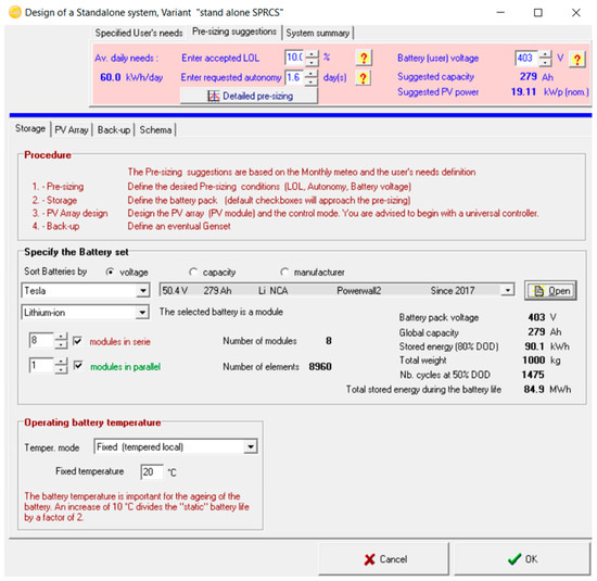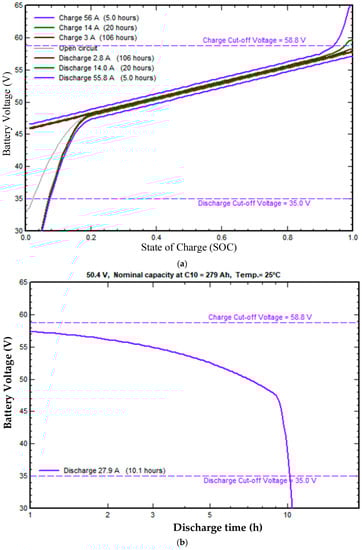 The charge/discharge vs. state of charge (SOC) and discharge characteristics curve for C10 are shown in Figure 9a,b. In that, the curve shows that the battery is capable of charging at 56 A for 5 h, 14 A for 20 h. Similarly, the battery could discharge at 55.8 A for 5 h. The discharge profile of the system was designed for C10. System batteries would discharge at 403 V at a nominal capacity of C10. From the curve, it was visible that for charging, cut-off voltage was 58.8 V and discharging, cut-off voltage was 35.0 V. Battery modelling was carried out in PVsyst, as shown in Figure 10. The chosen batteries were 50.4 V 279 Ah lithium-ion.