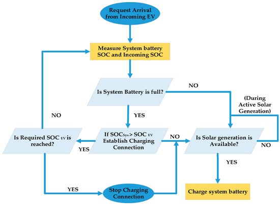 Based on the above algorithm, the system batteries got charged when there was abundant solar generation. The system would measure its SOC whenever there was charging or discharging sessions. Incoming request from EVs to get charged was monitored by the controller. The controller would compare the SOCs of both EV and the system, and then the system would initiate a charging session. Once the charging session was initiated, the controller would keep measuring the updated SOCs, and as per the algorithm, the controller may engage or disengage the charging session. The above constraints were simulated in MATLAB, and the proposed SPRCS could utilized for emergency charging.