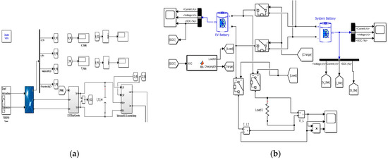 (a) Simulation model of plug and play SPRCS (PV system alone); (b) simulation model of plug and play SPRCS (battery section).