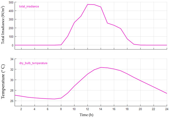 The first part of the simulation showed and explained about the standalone solar charging system to charge the proposed system. The proposed system consisted of batteries with the capacity of 279 Ah and 403 V. The solar system is fed with real-time irradiance and temperature data for the chosen location Subang Jaya, Malaysia. The array power was maintained at maximum by using an MPPT controller. From the controller, it was fed to boost converter to charge the system batteries (on-board batteries). The second part of the simulation showed the discharging of the on-board batteries to charge incoming EVs. The plug and play SPRCS was simulated using MATLAB/Simulink software shown in Figure 12a,b. The system consisted of standalone 20 kWp SPV that was connected to the MPPT controller. The MPPT controller was driven by the perturb and observation method. Incoming EVs battery was simulated as an incoming battery, which was directly coupled to the system batteries as direct coupling lead to fewer losses when compared with another available system. However, the main drawback of the system was that once the considered amount of charge was fed to EV battery the system battery would tend to lose its charge, which in turn will reduce the voltage. Therefore as of now, the present system after particular charging sessions, the system batteries cannot function in fast charging mode. The real-time input for the chosen location as a signal to the solar panel module in Simulink is shown in Figure 13.