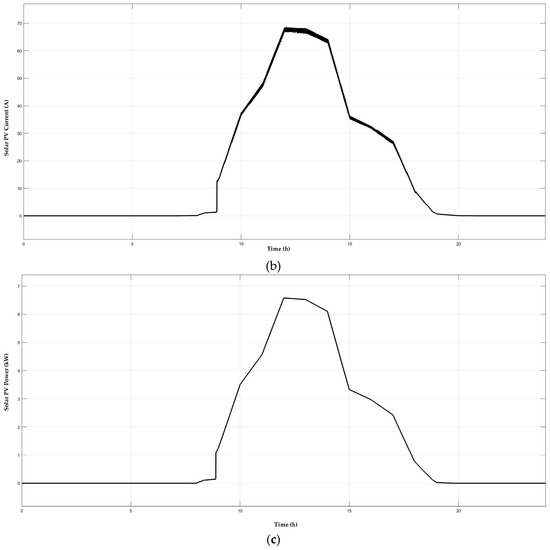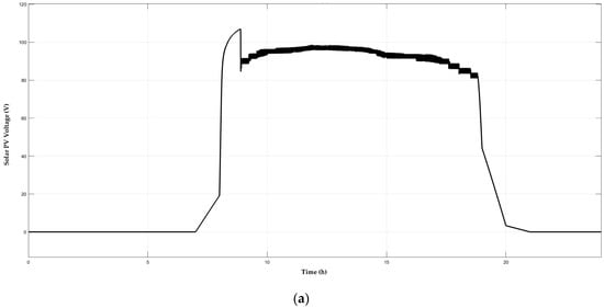 The voltage, current, and power produced from the SPV in which from the curve, it was understood that system batteries were charged during the entire generation are shown in Figure 14a–c.