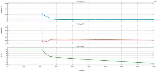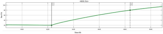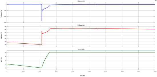 The battery discharging to feed the load, such as EV battery, is shown in Figure 15, Figure 16 and Figure 17. From the analysis of the SPRCS, Nissan LEAF ASCENTA [41] 40 kWh can give up to 168 miles. Which in turn states that rapid charging gives Nissan LEAF ASCENTA a 100-mile charge in 10.25 min. The above system output is provided without considering losses. Based on the design and from the charging curves, it is evident that charging from 20% to 80% would take approximately 10.25 min. Once we implement a real-time system there might be 5% to 10% more time to charge by considering the real-time system losses, battery temperature, and DOD of system battery the designed SPRCS could equally provide rapid charging as stated by CHArge de Move (CHAdeMO) [42].