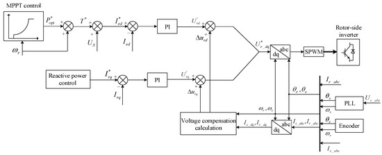 Once the stator voltage vector control is adopted, the active power of DFIG is controlled by the rotor current on the d axis, and the reactive power is controlled by the rotor current on the q axis. Thus, the active power and reactive power of DFIG are decoupled. The control diagram of the rotor-side converter is shown in the Figure 2 [8]. This control link contains double loops. The outer loop is a power loop, and the inner loop is a current loop. The rotor current reference, and , in the current loop are respectively determined by the maximum power point tracking control and the reactive power control in the outer loop. In the maximum power point tracking control, the relationship between active power reference value and rotor angular velocity is as follows: