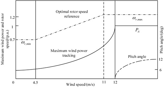When DFIG is in normal operation, converter control and pitch control are comprehensively applied to adjust the operation state of wind turbine [10,25,26]. In the case of low wind speed, the control purpose is to make the operating point follow the maximum power point tracking curve and capture the maximum wind energy. With the increment of wind speed, the rotor speed reaches the limit and maintains at the maximum. In the case of high wind speed, the wind energy capturing efficiency is reduced by adjusting pitch angle so that the output power of DFIG is maintained at the maximum (rated power) [27]. The relationship among rotor speed, active power, pitch angle and wind speed is shown in Figure 3.