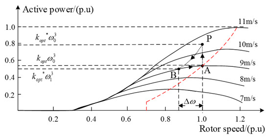 On the basis of Equation (3) and Figure 2, in order to complete the fast-frequency response by releasing the kinetic energy, we can modify the proportional coefficient to adjust the operation state of DFIG. Supposing the frequency change is , the proportional coefficient is modified to during the frequency regulation period, with the rotor angular velocity decreasing to to release rotational kinetic energy. The decrease range of rotor speed should not be too large (by limiting output power proportion of DFIG and active power reference) so as to ensure that the rotor will not absorb too much energy from the grid during the rotor speed recovery period. According to the maximum power point tracking curves under different wind speeds, if the rotor speed regulation is within the safe range, the secondary frequency drop would be avoided. Referring to Equations (13) and (3), supposing the range of rotor speed regulation is not too large, then we can find